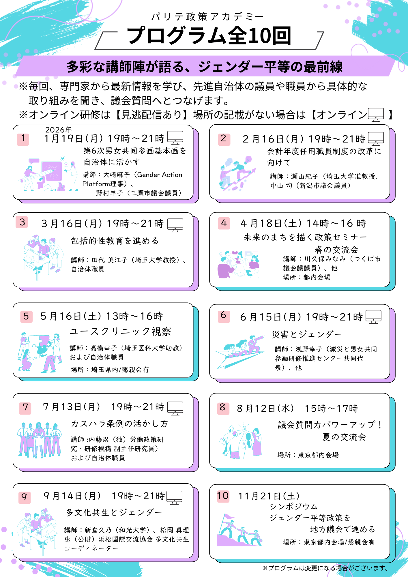 本プログラムでは、1〜2期目の女性地方議員を対象に、ジェンダーに関する最新情報を共有し、先進自治体の好事例に学び、議会質問力を向上させることを目指します。