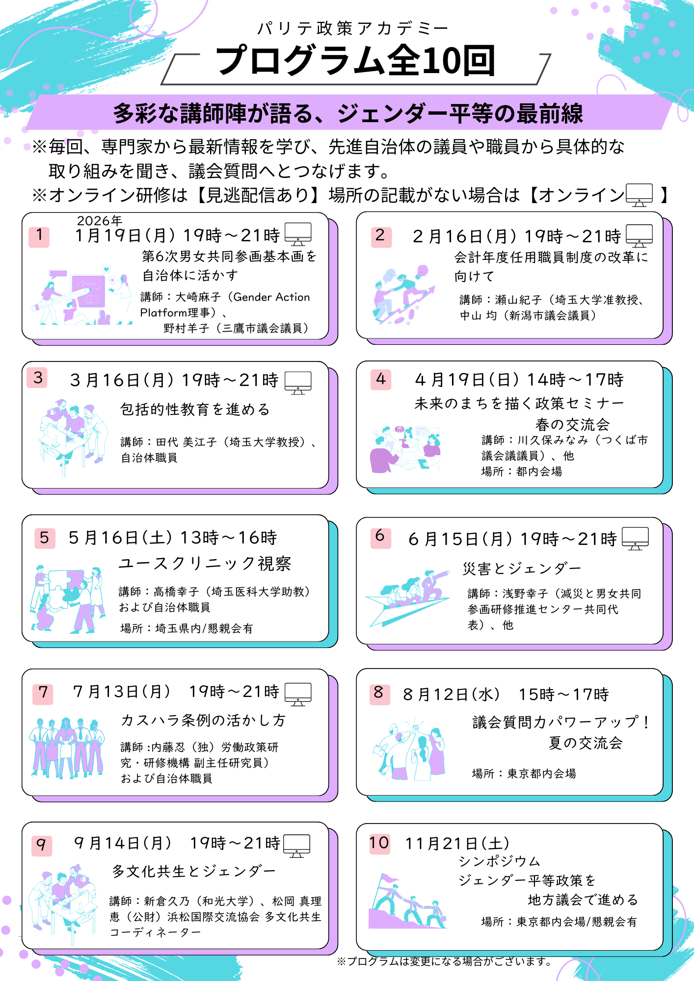 本プログラムでは、1〜2期目の女性地方議員を対象に、ジェンダーに関する最新情報を共有し、先進自治体の好事例に学び、議会質問力を向上させることを目指します。